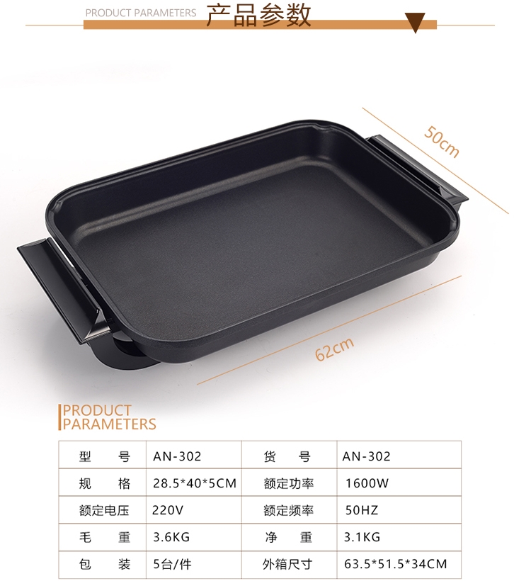 貨號:AN-302 規格:40*28.5*5cm(內部尺寸) 型號:AN-302 功率:1600W 電壓:220V/50HZ 外箱尺寸:63.5*51.5*34cm 毛重:3.6kg 凈重:3.1kg